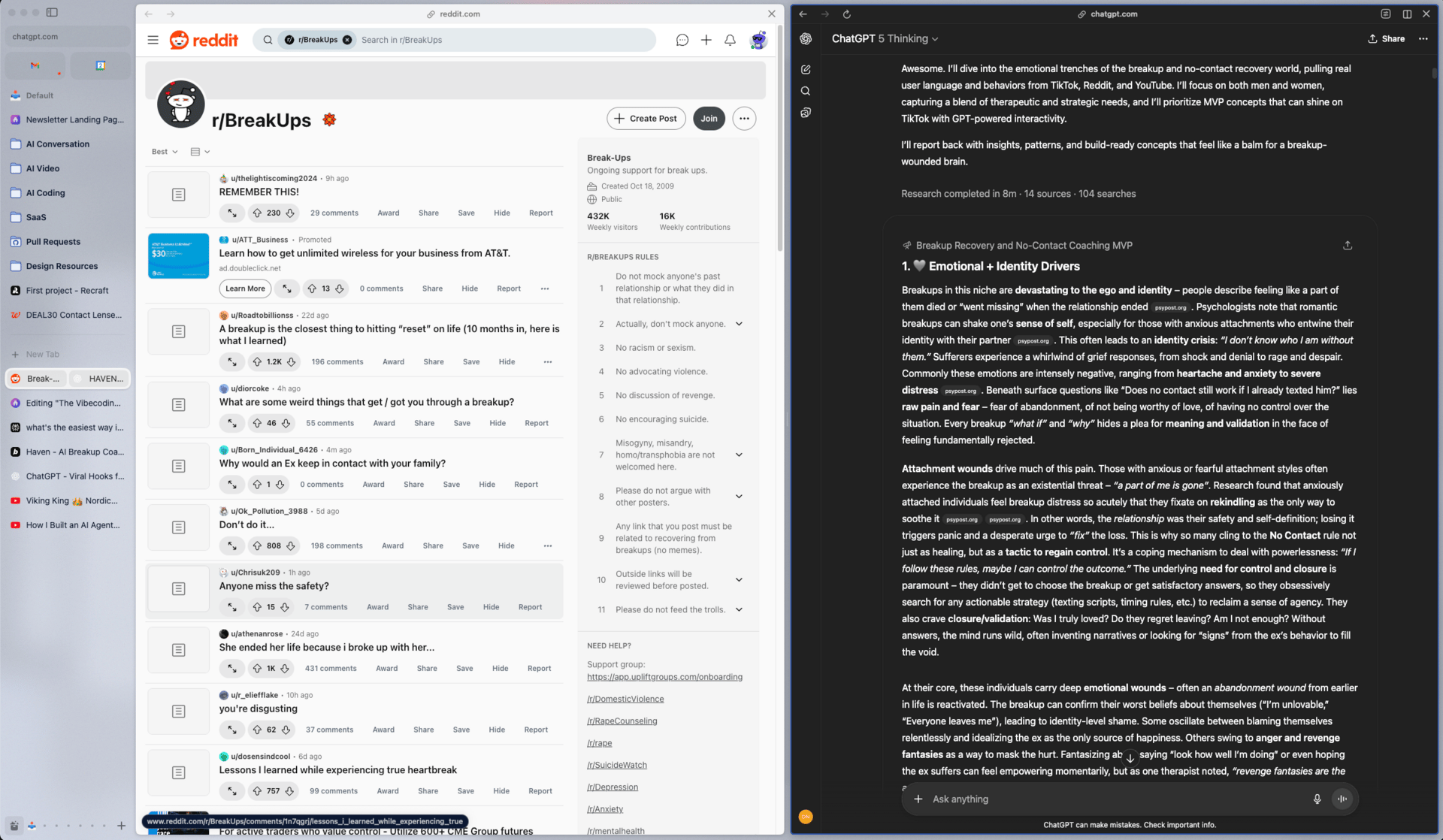 Before touching any tools, I spent 90 minutes on r/ExNoContact, r/BreakUps, and #healingjourney on TikTok. What I found was a blueprint for exactly what to build.