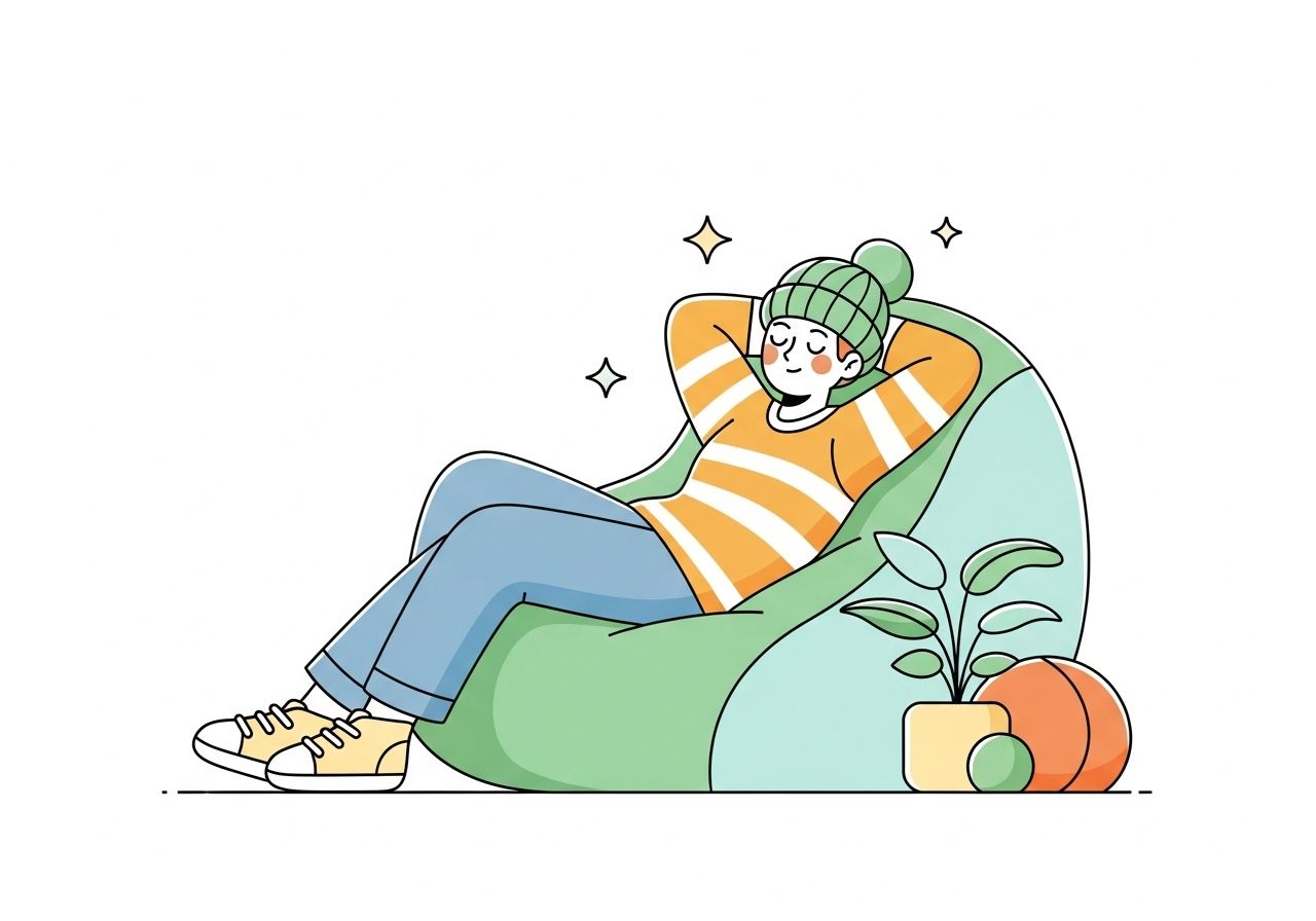 Style Reference: I found one illustration of a woman journaling on a beanbag. Soft, cozy, human. This became the north star for everything.