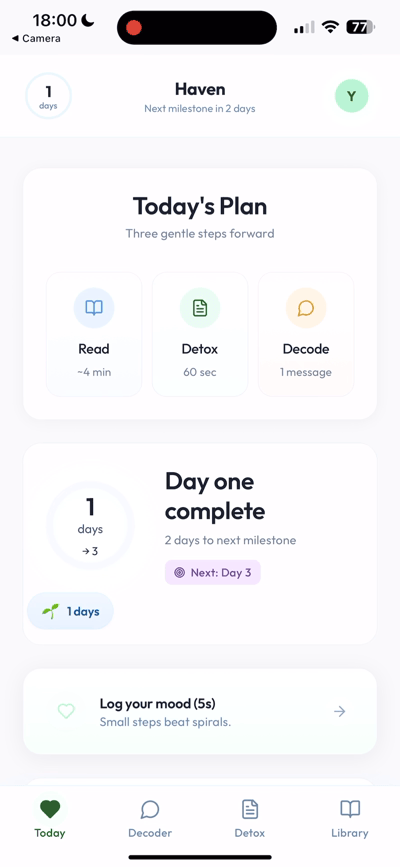 Lesson 1: Pain Has Patterns Every emotional pain point has observable behaviors. Don't guess what people need. Watch what they already do to cope. Haven users were already counting days, analyzing texts, seeking validation. I just gave them better tools for what they were already doing.